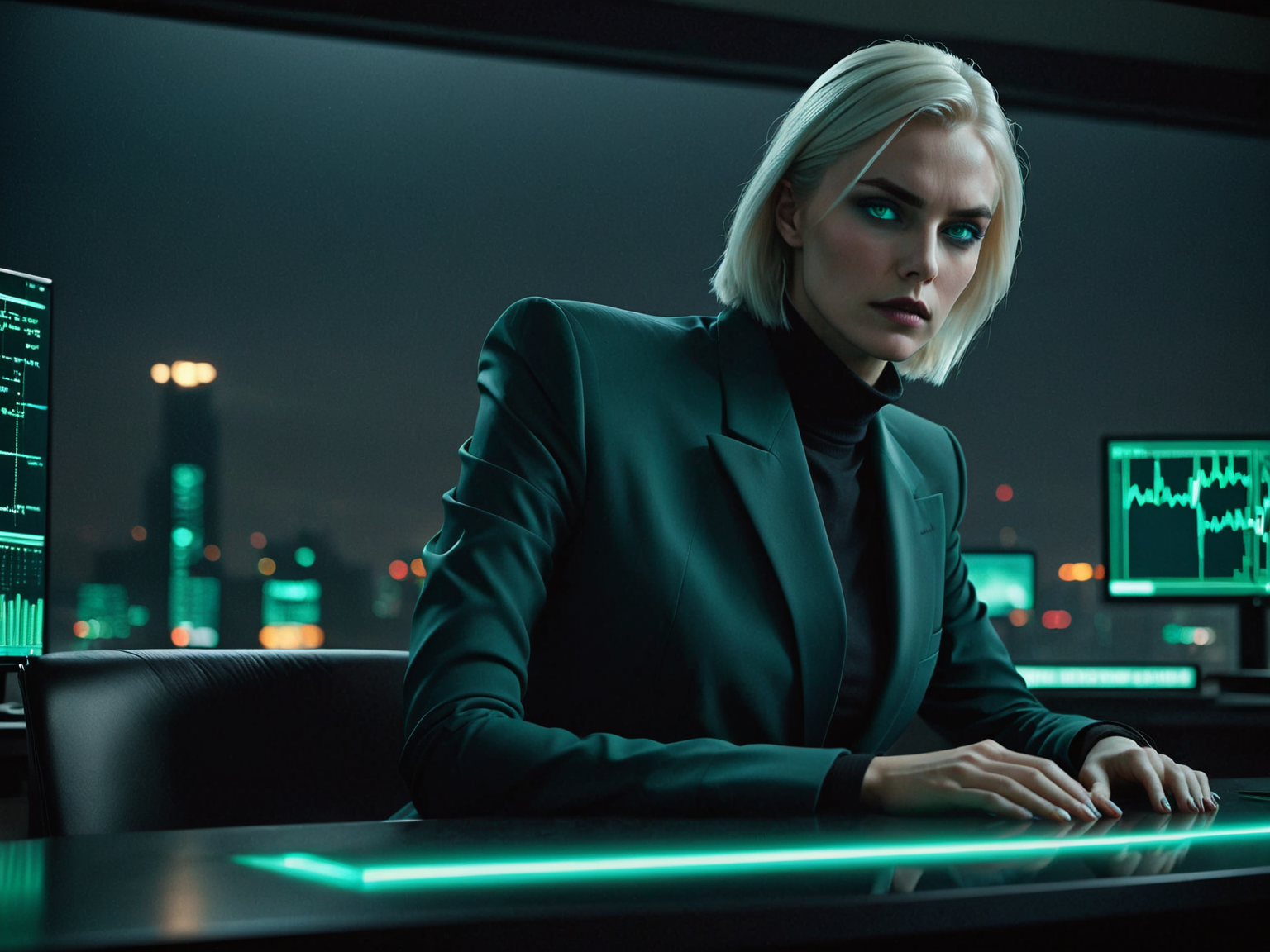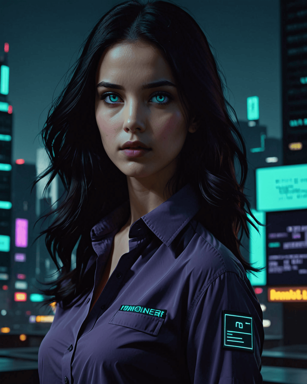 Eris mantiene la mirada un segundo más de lo necesario antes de responder. NeonMind coordina la respuesta con precisión excepto en ese instante donde algo no dicho flota entre ambas.