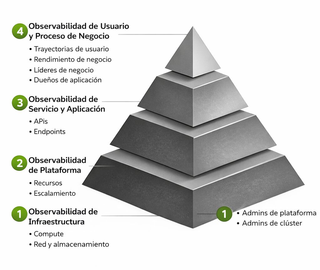 Registro de todas las acciones realizadas en la plataforma: cambios de configuración, accesos, modificaciones de umbrales y acciones de remediación. Disponible para auditorías del cliente.Niveles de servicio: ruta de madurez en observabilidad